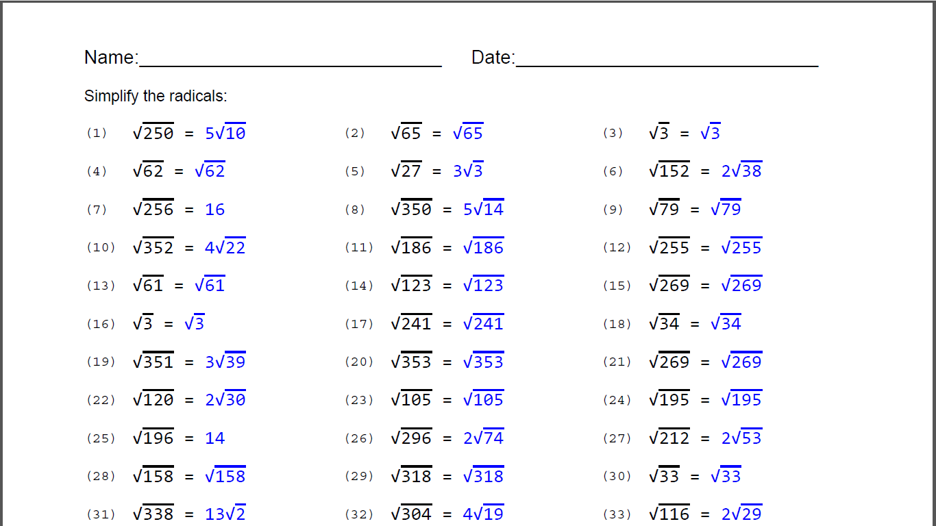 Some of the worksheets displayed are grade 9 simplifying radical expressions, simplifying radical. Our behavior in addressing problems affects our daily performance plus the joy of work. Finding hidden perfect squares and taking their root. There are only numbers under the radical. Create your own worksheets like this one with infinite algebra 1.